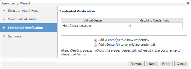 Add vCenter(s) to an existing credential: Select this option if you want to use an existing credential for the selected vCenter. This option is suitable if an existing credential has the information needed to access the vCenter. Click Next and continue to Step 9.
