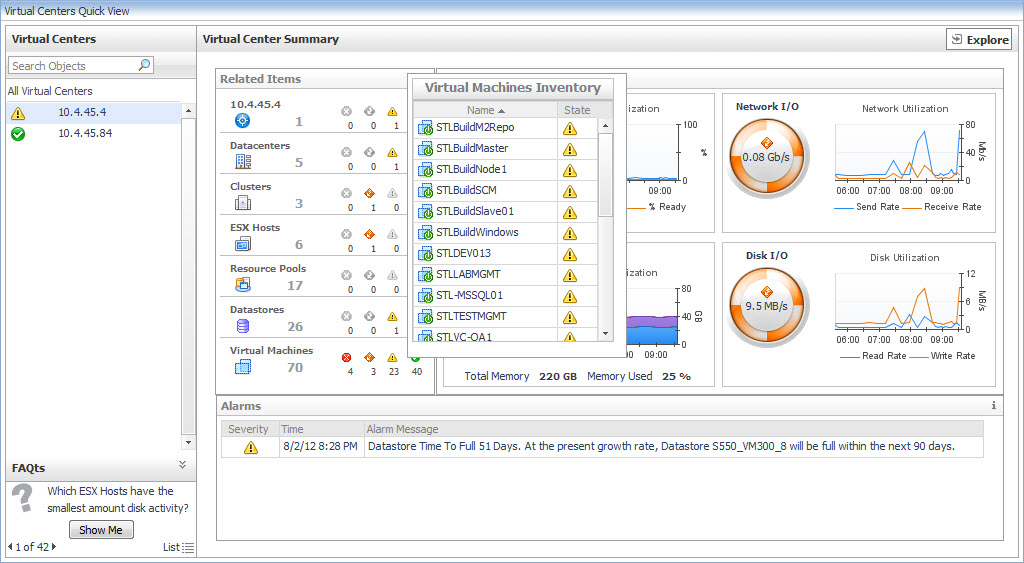 The VMware Environment dashboard is made up of the following views: the Virtual Environment Overview and Quick-View. Selecting an object type and its alarm state in the Virtual Environment Overview shows the summary information for your selection in the Quick-View. For reference information about the data appearing on this dashboard, see VMware Environment views .