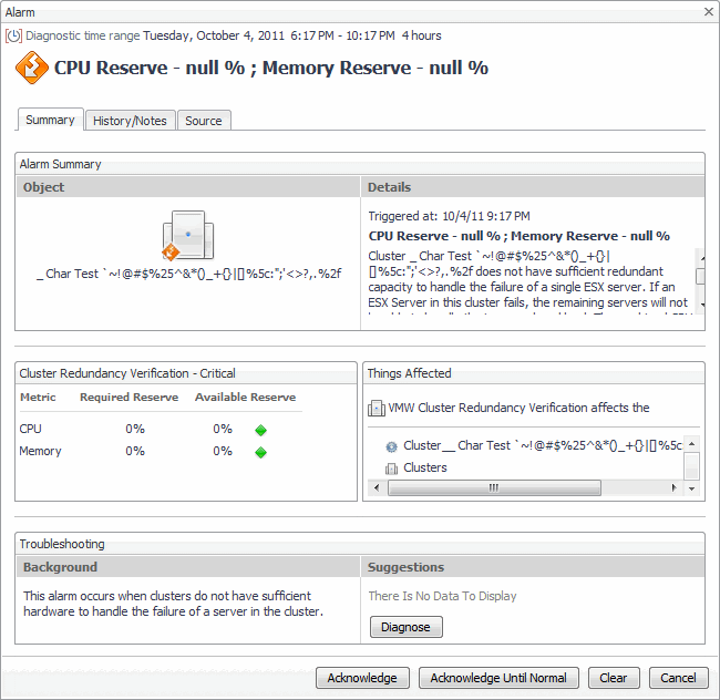 Virtual Center. The name of the virtual center associated with the selected cluster, followed by the related alarm counts.