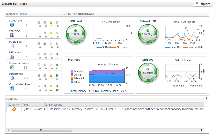 ESX Hosts. The number of ESX hosts that are associated with the selected cluster, followed by the related alarm counts.