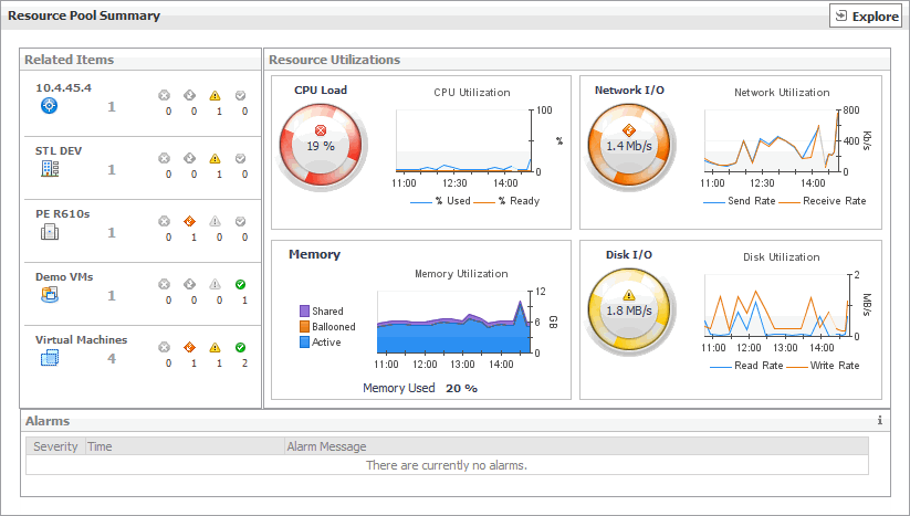 Virtual Center. The name of the virtual center associated with the selected resource pool, followed by the related alarm counts.
