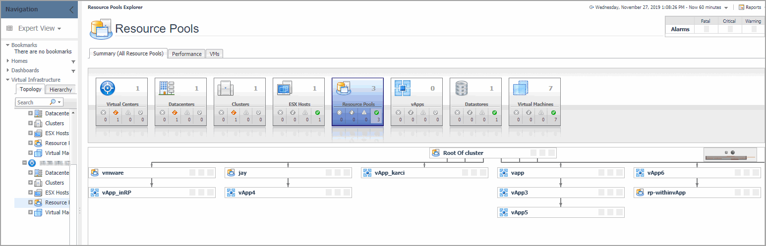 The Virtual Infrastructure view contains a navigation tree on the Topology tab that represents the various virtual infrastructure objects: Virtual Centers, Datacenters, Clusters, ESX Hosts, Resource Pools, and Virtual Machines. For each individual object or group of objects, a status indicator appears, showing the alarm of highest severity that is outstanding for the that object or objects. For example, there are 25 virtual machines configured for a vCenter. Twenty of the virtual machines have a normal status, three have a warning status, and two have a critical status. In the Topology view, the virtual machines container for that vCenter displays a critical status indicator to show that at least one of the virtual machines associated with the vCenter has an outstanding critical alarm.