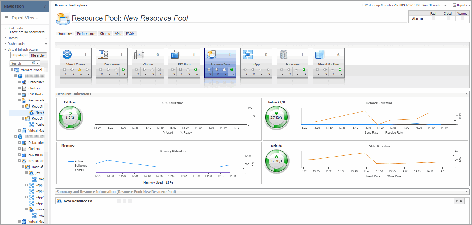 The Utilizations view, typically located across the center of the display area tab, provides numerical and graphical representations of utilization metrics associated with the selected object or group of objects. For example, selecting a single resource pool from the Virtual Infrastructure view and opening the Performance tab in the display area, displays four graphs in the Utilizations view, showing CPU, memory, disk, and network resource utilizations for the selected resource pool.