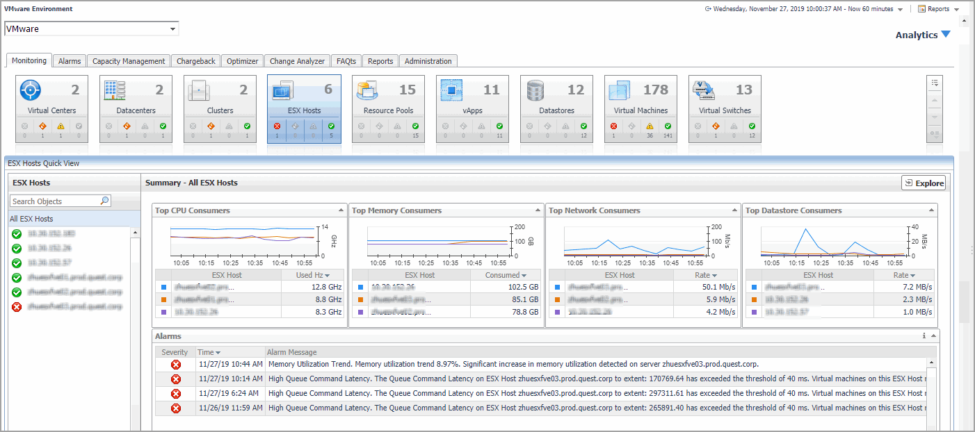 When you navigate to the VMware Environment dashboard for the first time, the Monitoring tab appears open. This tab provides an overall summary of your virtual environment. Other tabs are also available. This topic describes the Monitoring tab. For information about other tabs, see the following topics: