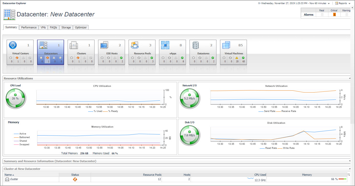 A typical virtual environment contains a set of ESX® host and virtual machines. An ESX host can be a part of a cluster, and can have one or more virtual machines associated with it. Other components of a Virtual Center include datacenters, resource pools, vApp, and data stores. You can view the overall state of these components on the VMware Environment dashboard.
