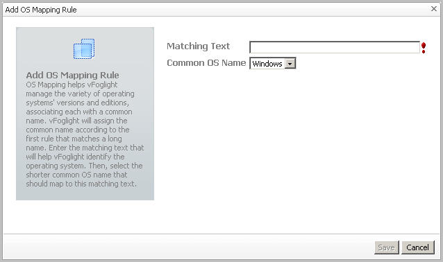 In the Add OS Mapping Rule dialog box, in the Matching Text box, type the OS name with its edition and/or version number to help Foglight for VMware identify the operating system. |