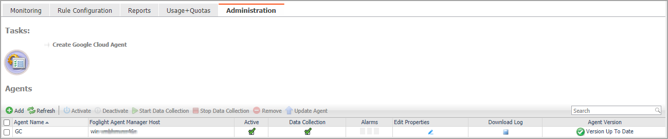 Start Data Collection: Starts the data collection for one or more selected agent instances. Starting an agent’s data collection causes the agent to begin monitoring the Google Cloud platform and to send the collected metrics back to the Management Server.
