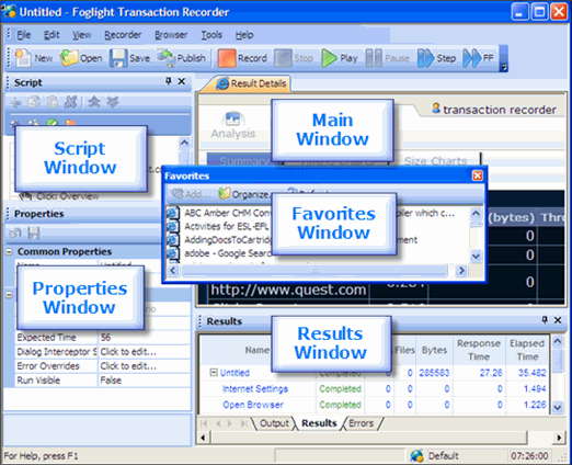 Foglight Transaction Recorder. The Foglight Transaction Recorder is a Windows-based application used for the creation of scripts that model an end-user’s actions against a monitored server environment. After download and installation, the Foglight Transaction Recorder records scripts in a graphical environment resembling an internet browser. Once recorded and played back, the user can set expected times that help determine acceptable time frames the script and parts of the script can run within. When the scripts are played back and configured satisfactorily, they are published to Foglight. |