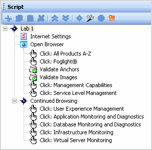 Foglight. In Foglight, scripts or services are configured into a Service Group that defines the application. These Service Groups are then assigned to a Transaction Player agent to be played back at defined intervals, reporting their timings back to Foglight. These timings, using the advanced rules engine of Foglight, are then compared to the expected times initially set in the recording of the scripts, but can be overridden on the server. The rules engine can take any defined action based on the results. |