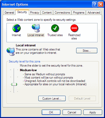 Windows Server® 2003 has implemented stricter security elements in Internet Explorer. It is recommended that all Transaction Player agents be set to run Play Script as User in the Foglight. In Windows Server 2003, the default security setting for all users is “High”. This setting can cause problems with some scripts, depending on the content of the sites being monitored. The Internet Explorer security setting for that user can be changed to Medium-low. This setting is appropriate for intranet sites and other sites that are trusted. To properly set up Windows Server 2003 Security settings you must:
