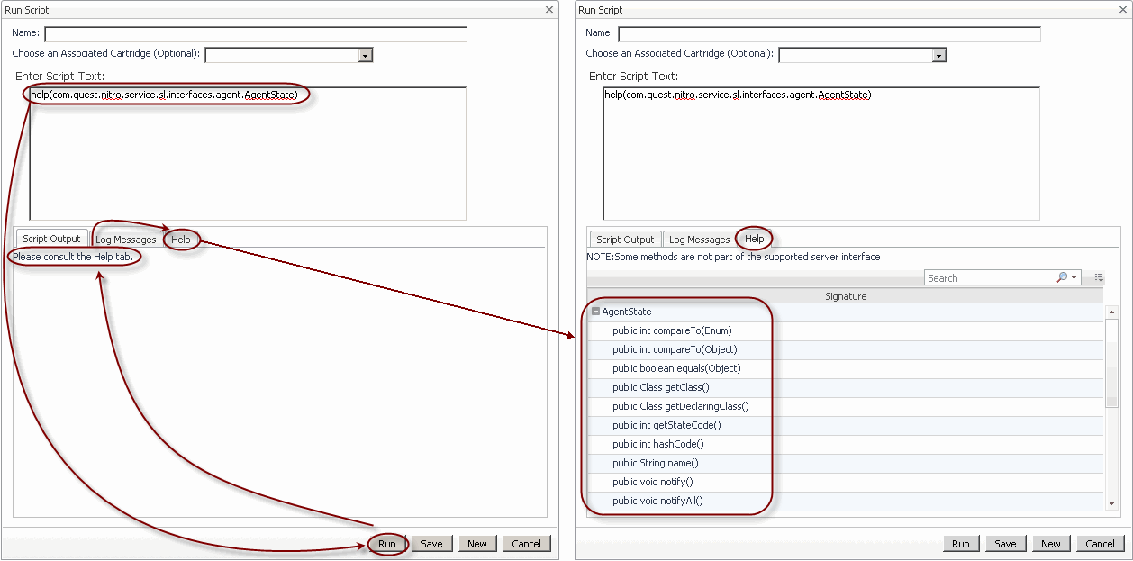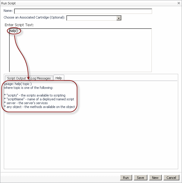 The Help tab, available in the Run Script dialog quickly provides the information you need after typing a desired help command in the Enter Script Text box and clicking Run.