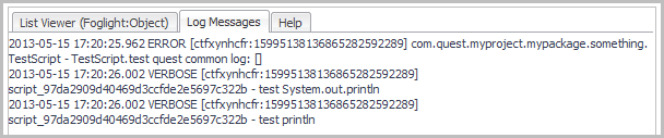 If any log messages are generated during the script run, they appear on the Log Messages tab. The script example used in this procedure does not result in any log messages being generated. If you want to see an example of this feature, you can type the following script and then examine the log message on the Log Messages tab.