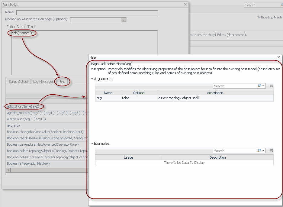 The script name is case sensitive and does not include script arguments. For example, to display information about the script adjustHostName(arg), type help("adjustHostName"). Typing help("AdjustHostName") or help("adjustHostName(arg)") results in an error: AdjustHostName is not a valid script name.