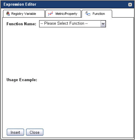 To insert a function into an expression, in the Condition Editor (rules) or Expression Editor (derived metrics) dialog box, open the Function tab.