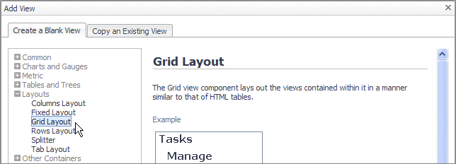 In the Add View dialog box that appears, on the Create a Blank View tab, choose Layouts > Grid, and click OK.