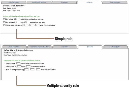 Setting this option to x causes the rule’s actions (simple and multiple-severity rules) and alarms (multiple-severity rules only) to execute when the number of evaluations defined by x are true.