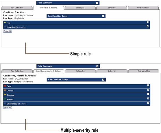 There are two types of rules in Foglight: simple rules and multiple-severity rules. A simple rule has a single condition, and can be in one of three states: Fire, Undefined, or Normal. A multiple-severity rule can have up to five severity levels: Undefined, Fatal, Critical, Warning, and Normal.