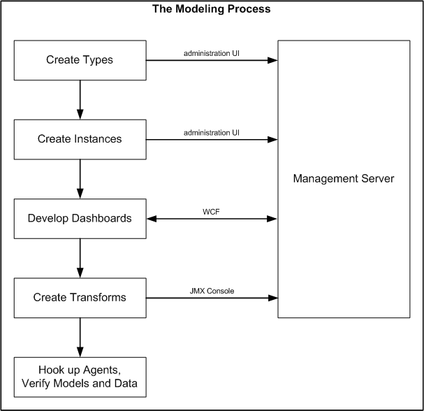 The third step in the modeling process is to create dashboards using WCF. You can perform dashboard creation with just the types deployed, as long as the type definitions include metric definitions. However, it is difficult to test the dashboards without instances.