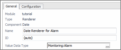 Another example, this time for a Date Renderer, shows that if you set the Value Data Type to Monitoring:Alarm, then you can edit the Date property to set it to a Context Selection Binding with an Input Key of value, and Path of createdTime in order to render the Created Time property of an alarm as a date.
