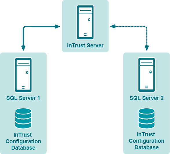 A common and often inexpensive approach to recovery after failure is to maintain a standby system to assume the production workload if a production system failure occurs. A typical configuration has one InTrust server and two identical SQL server computers with a copy of the InTrust configuration database. If the InTrust configuration database becomes unavailable, the InTrust server can switch to the other SQL server, as shown in the picture below:
