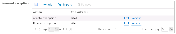 A password exception list can be created. This exception list will allow specific sites to handle remembering passwords differently than the regular configuration. Click Add to add a site as an exception. Click Remove to remove a site from the list. Click the Import button to import a list of exceptions to the list.