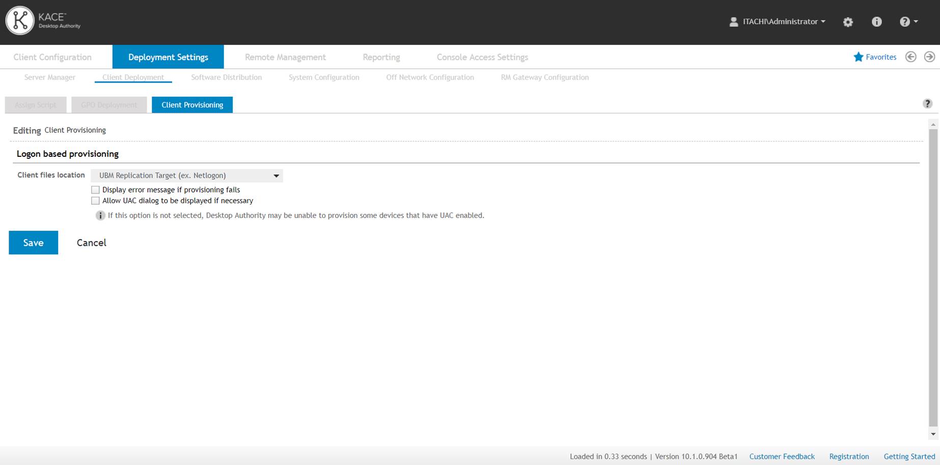Client Provisioning is configured by selecting Deployment Settings > Client Deployment > Client Provisioning. Click the Edit button and configure Logon-based provisioning by specifying a preferred domain, domain controller and the client files location. Desktop Authority will do the rest of the work for you.
