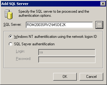 You can select either Windows integrated authentication or SQL Server authentication. If SQL Server authentication is selected, enter the login ID and the password, and then click OK.