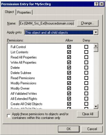 7. In the Select User, Computer, or Group (or similar) dialog box, select the Source Exchange Account (in our example, QMM_Src_Ex) and click OK.