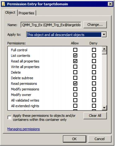To work with the target Active Directory objects, the Target Exchange Account needs the Full Control permission on the organizational units and their child objects that contain the objects to be synchronized. This permission should be set on the domain controller where the objects you need to synchronize are located.