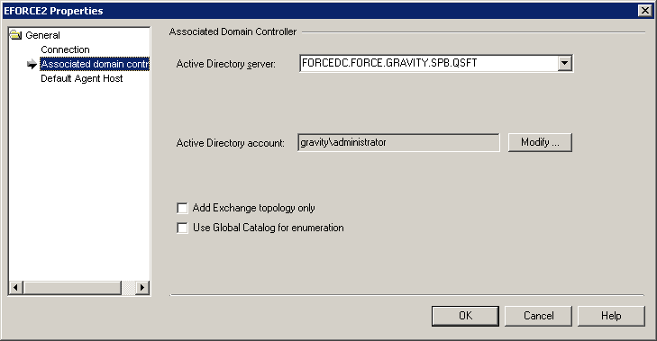 The Connection page displays the name of the server or database availability group (DAG) for which the connection settings are configured. The settings for a DAG, an Exchange server in a DAG and an individual server differ slightly. This is because different synchronization jobs are available in different configurations, as follows: