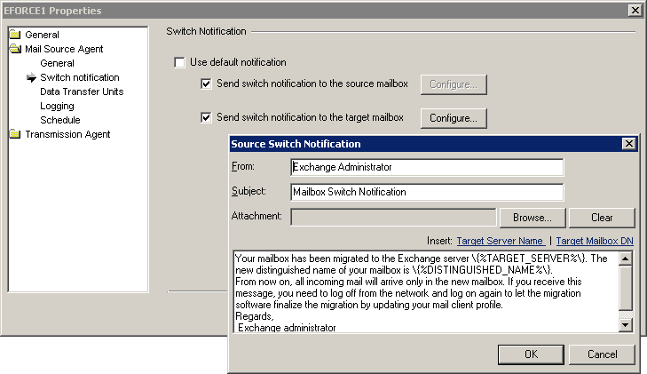 The Mail Source Agent can send a notification message to each user whose mailbox has been switched. The Switch notification page in the properties of the Mail Source Agent allows you to edit this message and select whether the notification should be sent to the source mailbox, the target mailbox, or both.