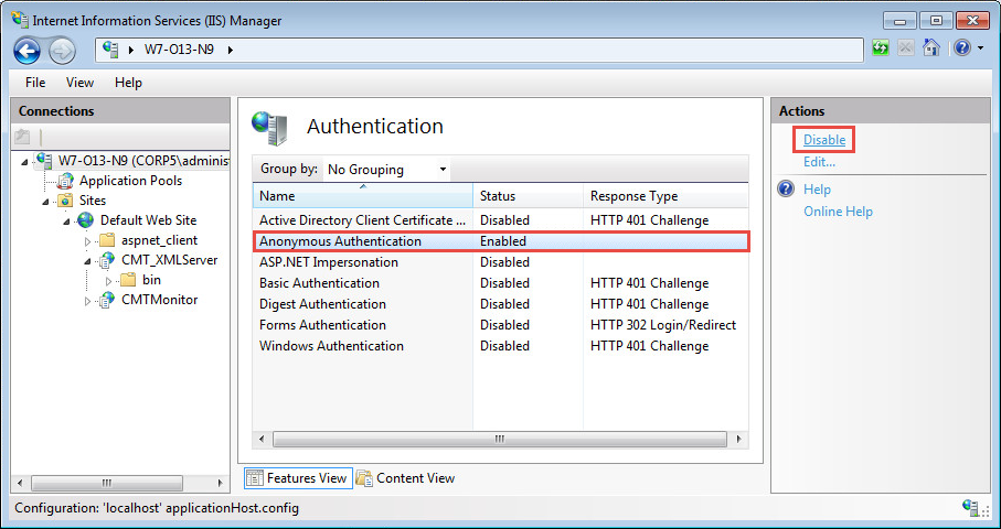 • Expand Web services in the Internet Information Services (IIS) management console, and select the CMT_XMLServer site; open the Authentication options: