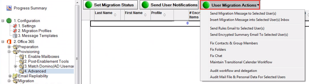 Click on the Advanced | User Migration Actions button to access additional functions: