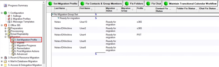 1. Expand the Migration | 1. Set Migration Profile views, select users and click the Set Migration Profile button: