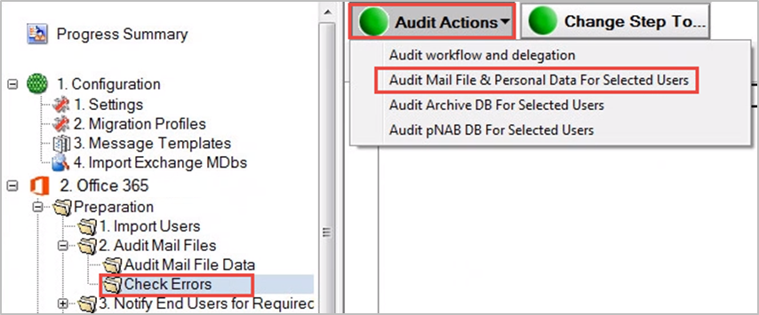 1. After the error is resolved, to re-audit the user, select the user in the Check Errors view and, from the Data Pane, click the Audit Actions | Audit Mail File & Personal Data For Selected Users button in the Data Pane: