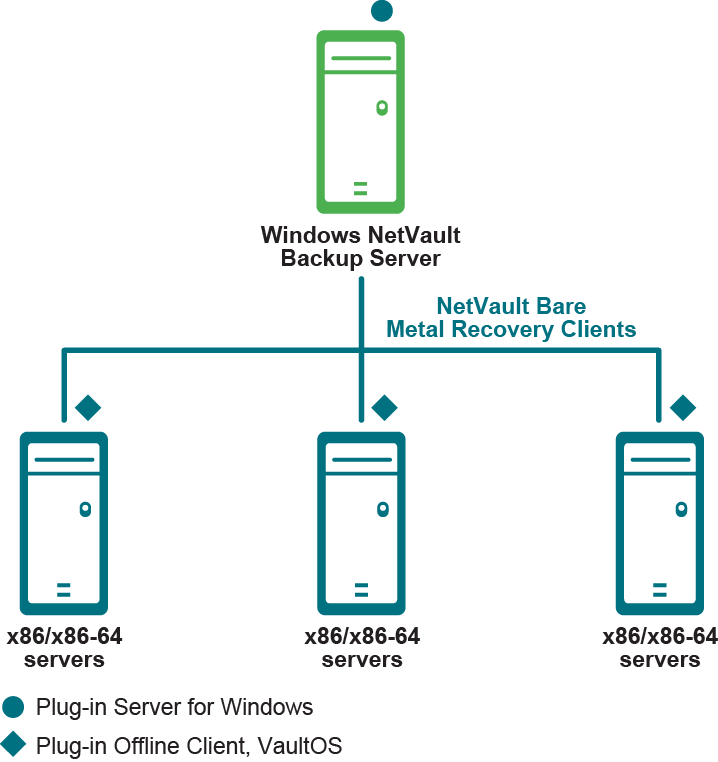 ここでは、WindowsベースのNetVault ServerにPlug-in Serverfor Windowsコンポーネントがインストールされており、Plug-in Offline ClientがIntel x86 Clientのバックアップとリカバリの実行に使用されています。
