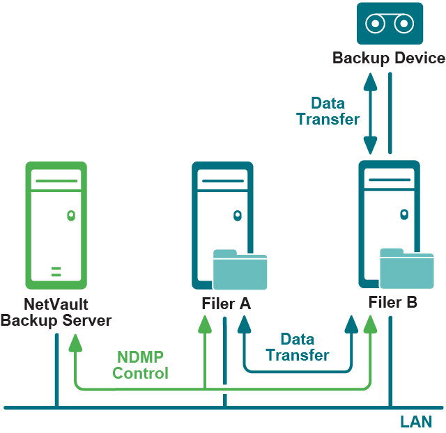 Le modèle de sauvegardes NDMP entre trois entités hétérogènes est semblable au modèle de sauvegarde en attachement direct, excepté que, dans ce modèle, les machines NetVault Backup sur le réseau utilisent également le périphérique à bandes attaché à l'utilisateur organisé pour les sauvegardes et restaurations.