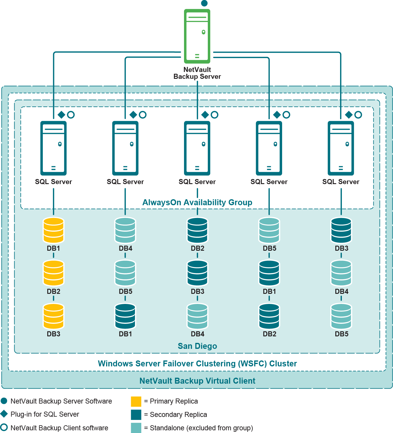 중요: NetVault Backup 용어에서 클러스터 노드를 가상 클라이언트라고 합니다. SQL Server용 플러그인 의 가상 클라이언트에 대한 참조는 기본적으로 SQL Server 장애 조치 클러스터 환경 또는 AlwaysOn 가용성 그룹의 가상 서버에 대한 참조입니다.