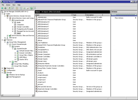 After installation is finished, verify that the new domain user has been created. To do so, log in to the Windows Domain Controller, and access Server Manager > Roles > Active Directory Domain Services > Active Directory Users and Computers > DomainSample > Users. |