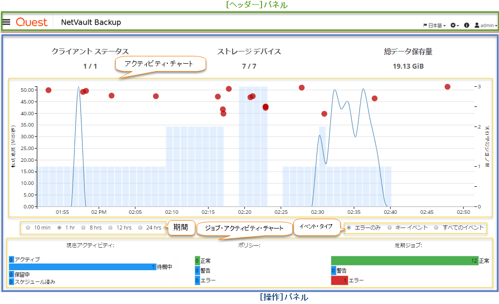 すべてのNetVault Backupの操作を実行するための主な場所です。[操作]パネルには、[ナビゲーション]パネルで選択した項目に応じて、さまざまなWebUIページが表示されます。