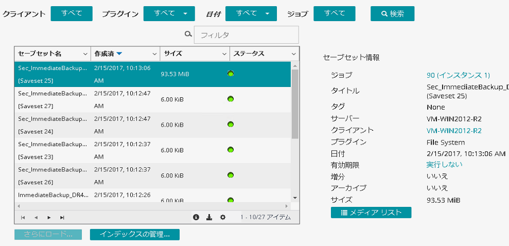 作成された特定のクライアントのセーブセットを表示します。