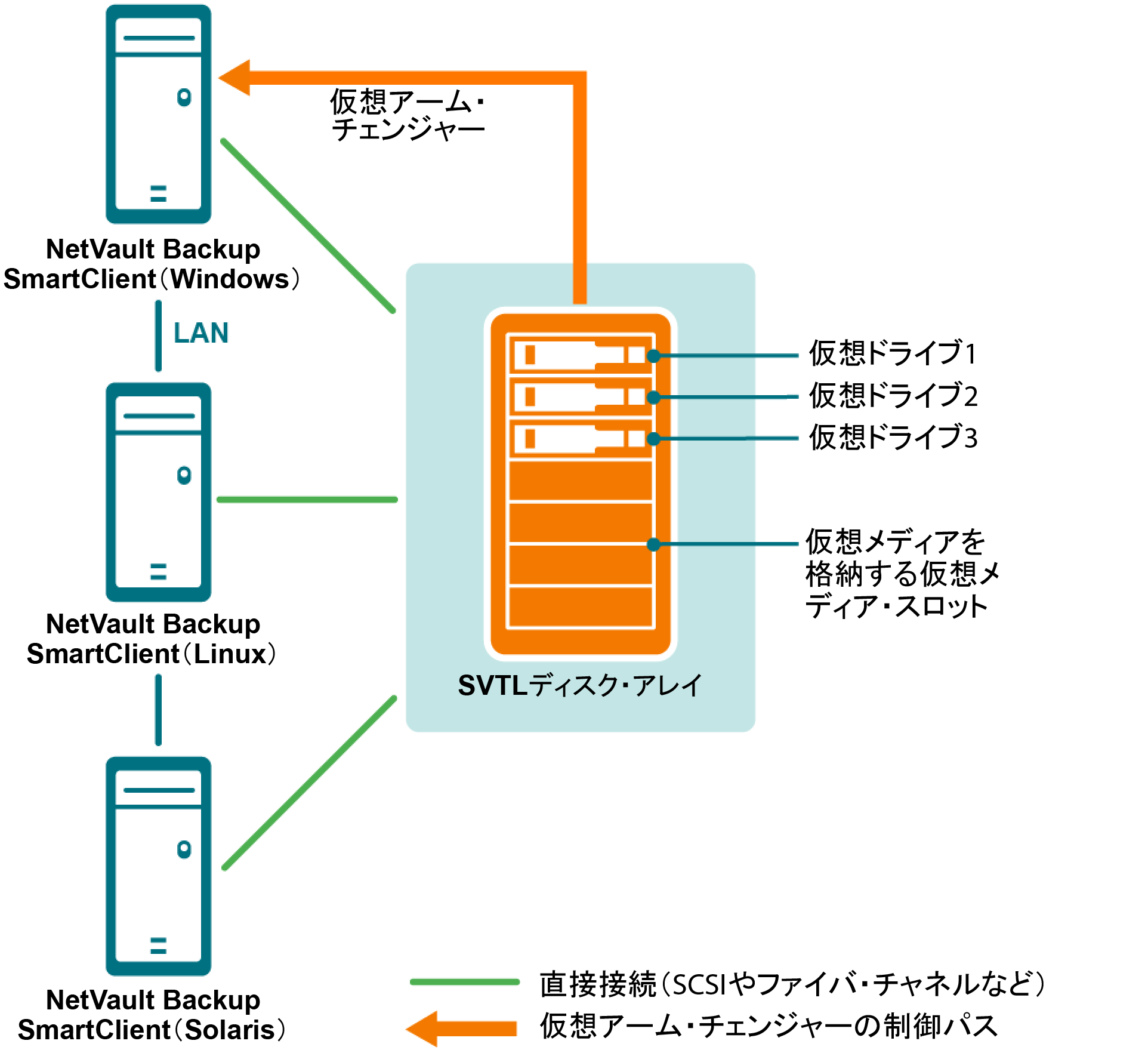 NetVault Backup共有仮想テープ・ライブラリ(SVTL)では、VTLを複数のNetVault Backupマシンと共有してLANを使用せずにバックアップすることができ、これによってVTL実装が拡張されます。