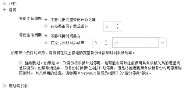 要在备份高级选项集中指定索引保留期,选择在经过此时间后变为离线索引选项。输入或选择要保留索引的时间长度,然后在关联列表中,选择选项。