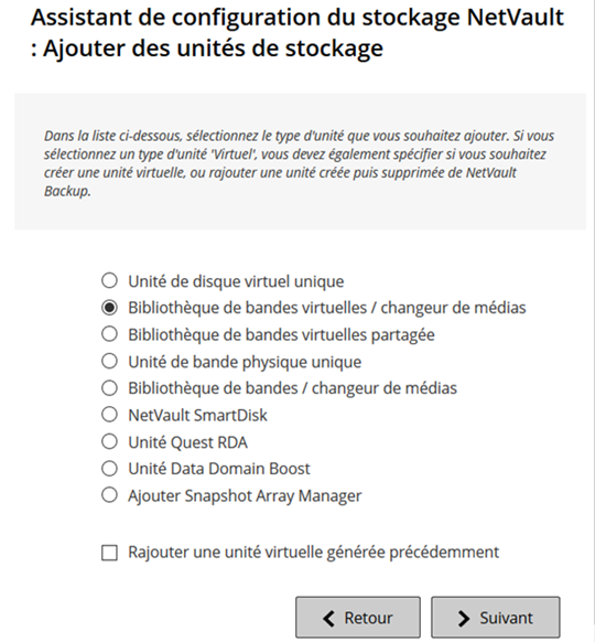 Sur la page Ajouter des unités de stockage, sélectionnez l'option Unité QuestRDA, puis cliquez sur Suivant.