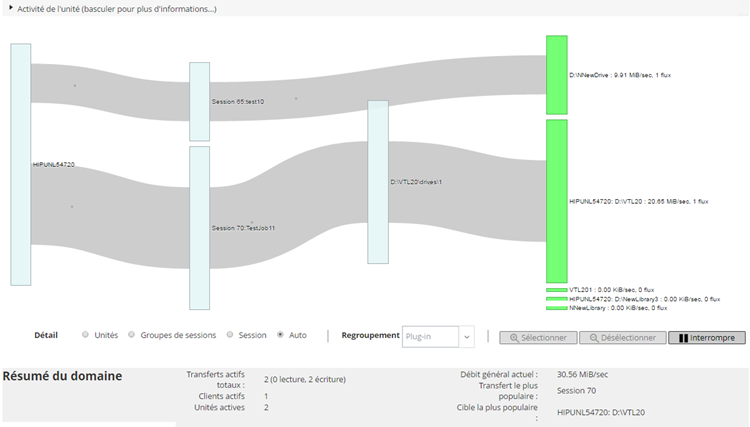 Session : sélectionnez cette option pour afficher les transferts de données depuis des clients vers des sessions, et depuis des sessions vers des unités de stockage.