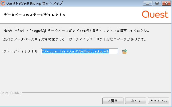 NetVault Backupのデフォルトのステージ・ディレクトリ・パスは、既存のデータベース・パスと同じです。