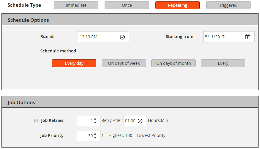 默认情况下,预定义的集“立即”处于选中状态。要在提交任务后立即运行该任务,请使用此集。