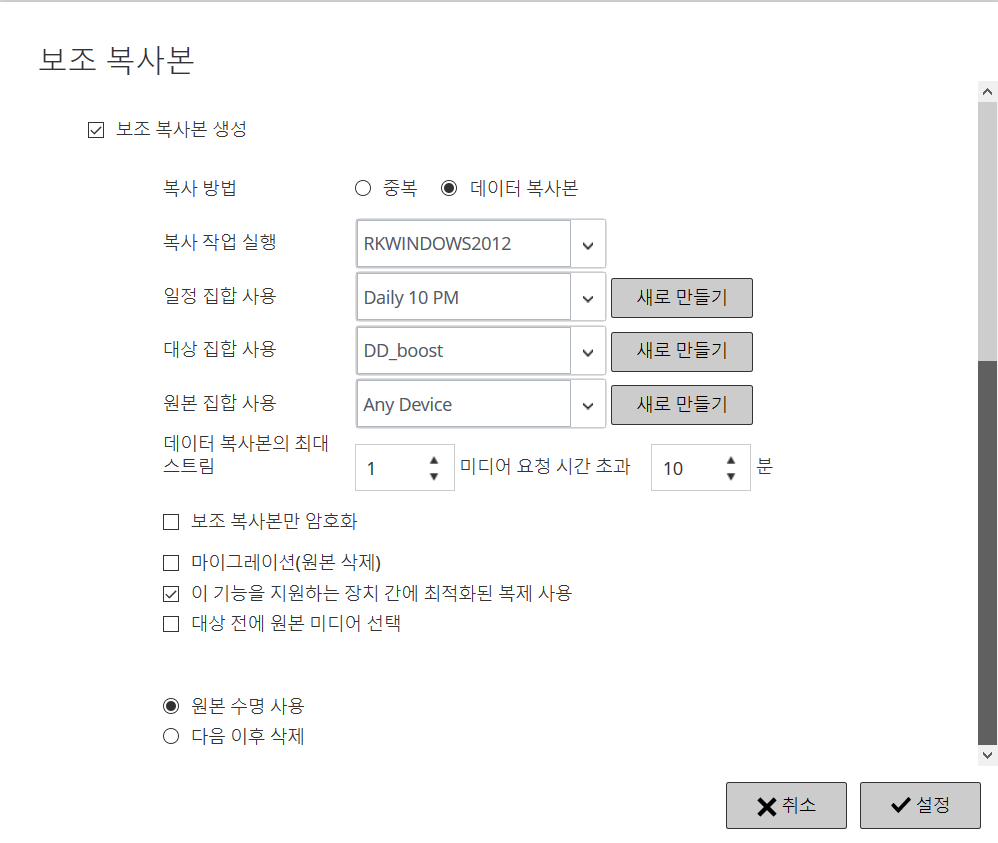 보조 복사본 생성 확인란을 클릭하고 다음 설정을 구성합니다.