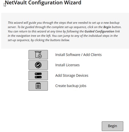 L’interface Web de NetVault Backup fournit un assistant de configuration qui vous guide à travers les divers aspects de la configuration de votre système de sauvegarde. Vous pouvez utiliser l’Assistant pour installer des packages de clients et de plug-ins, ajouter des clients, configurer des unités, installer des clés de licence et créer des sessions de sauvegarde. L’Assistant de configuration est accessible à partir de la Configuration guidée lien dans le volet Navigation.