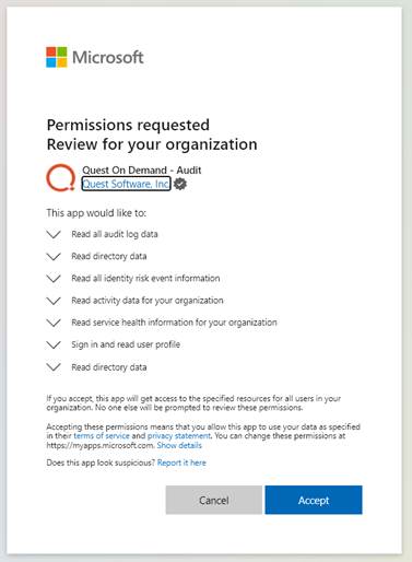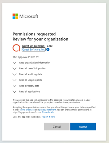 On Demand Audit requires access to the customer’s Microsoft Entra and Microsoft 365 tenants. The customer grants that access using the Microsoft Admin Consent process, which will create a Service Principal in the customer's Microsoft Entra ID with minimum consents required by On Demand Audit (Groups, Users, Contacts).